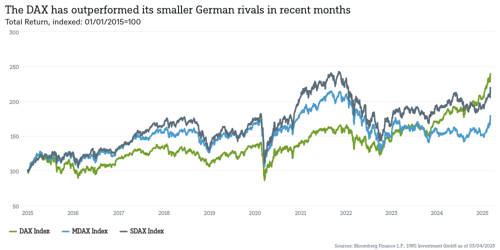 The election victory of the Christian Democratic Union (CDU/CSU) under party leader Friedrich Merz in February has also had a positive impact on German stocks. Especially the domestically focused equities in the MDAX have reacted most positively. Overall, there seems to be relief that another unwieldy three-party coalition has been avoided and investors hope that a business-friendly government could raise defense spending and investment in infrastructure.[3] However, we believe that there might be a good chance that much of this hope is already priced into German stocks.