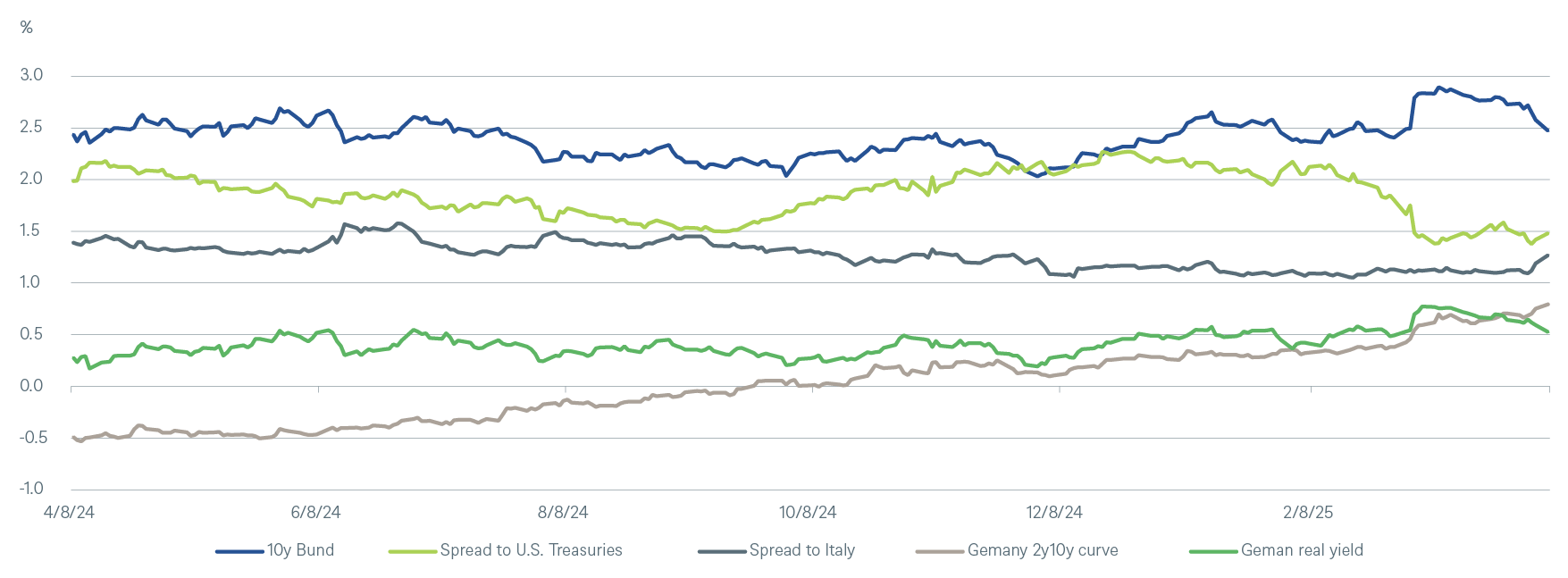 German government bonds have reacted quite cautiously to the package overall. The initial impressive jump of 30 basis points in yields almost halved over the course of three weeks. The bond markets are now dominated by economic rather than inflation concerns. In response to the fiscal package and expected impact of potential Trump tariffs we have cut the forecast for interest-rate cuts by the European Central Bank (ECB) from three to one up to and including March 2026. Whether this needs to be amended because of the actual tariff policies remains to be seen.