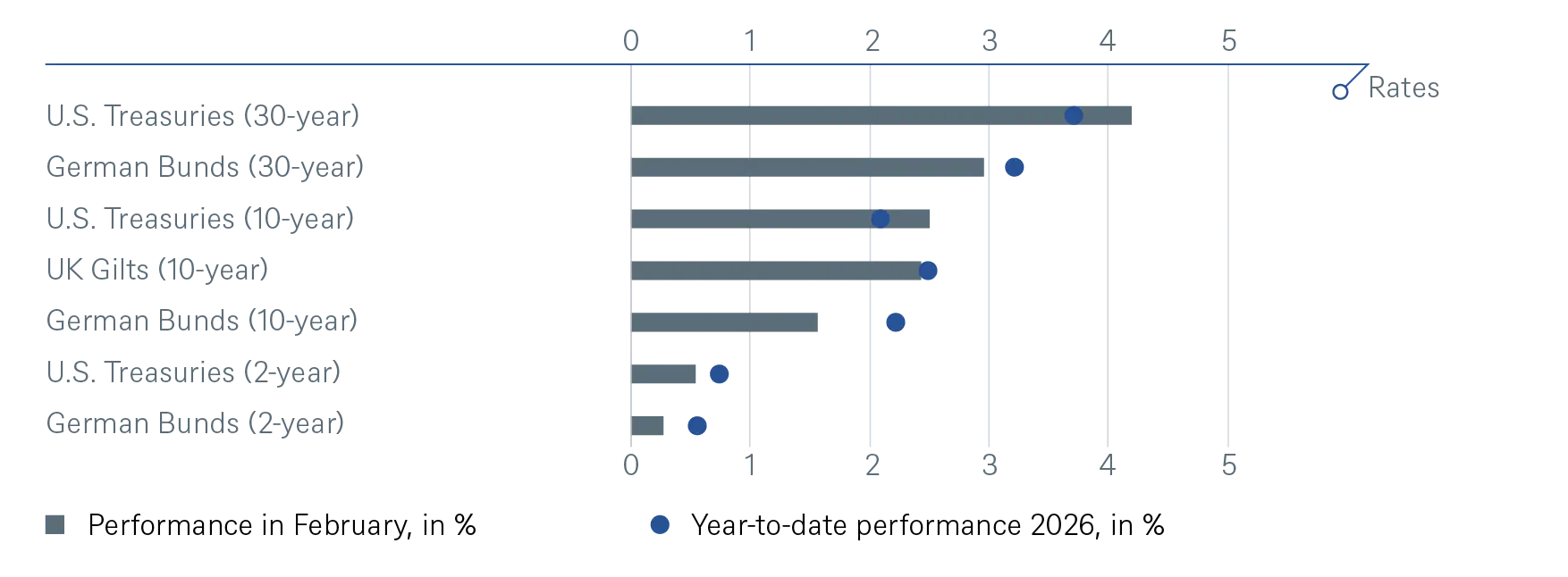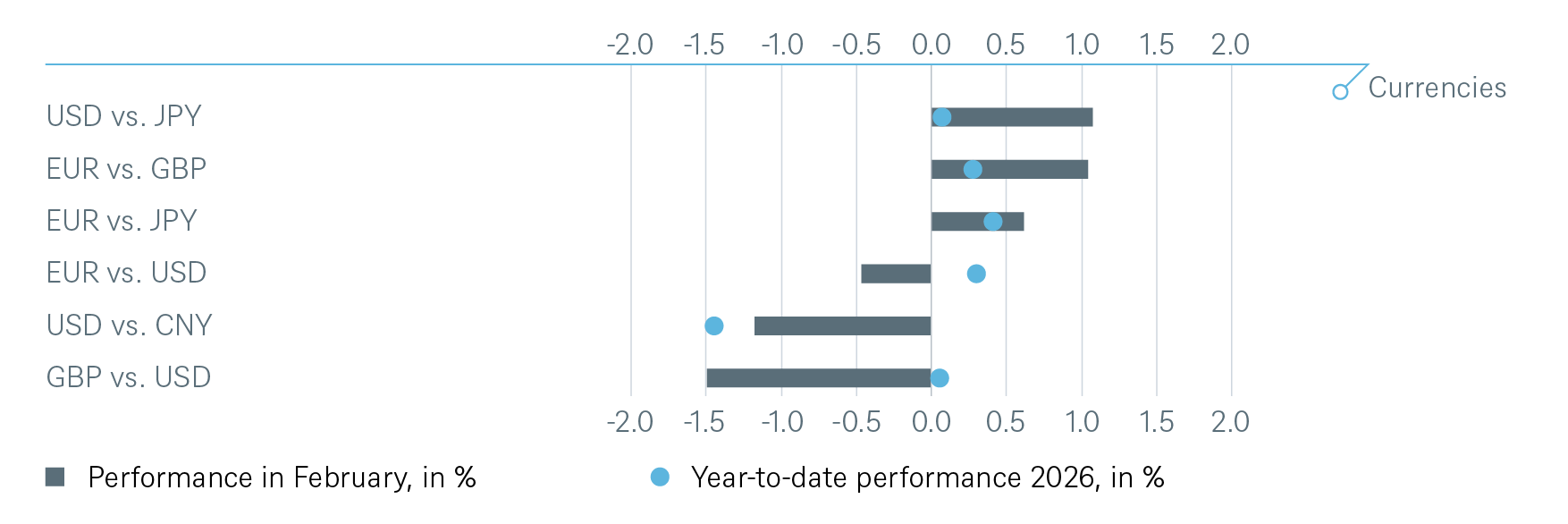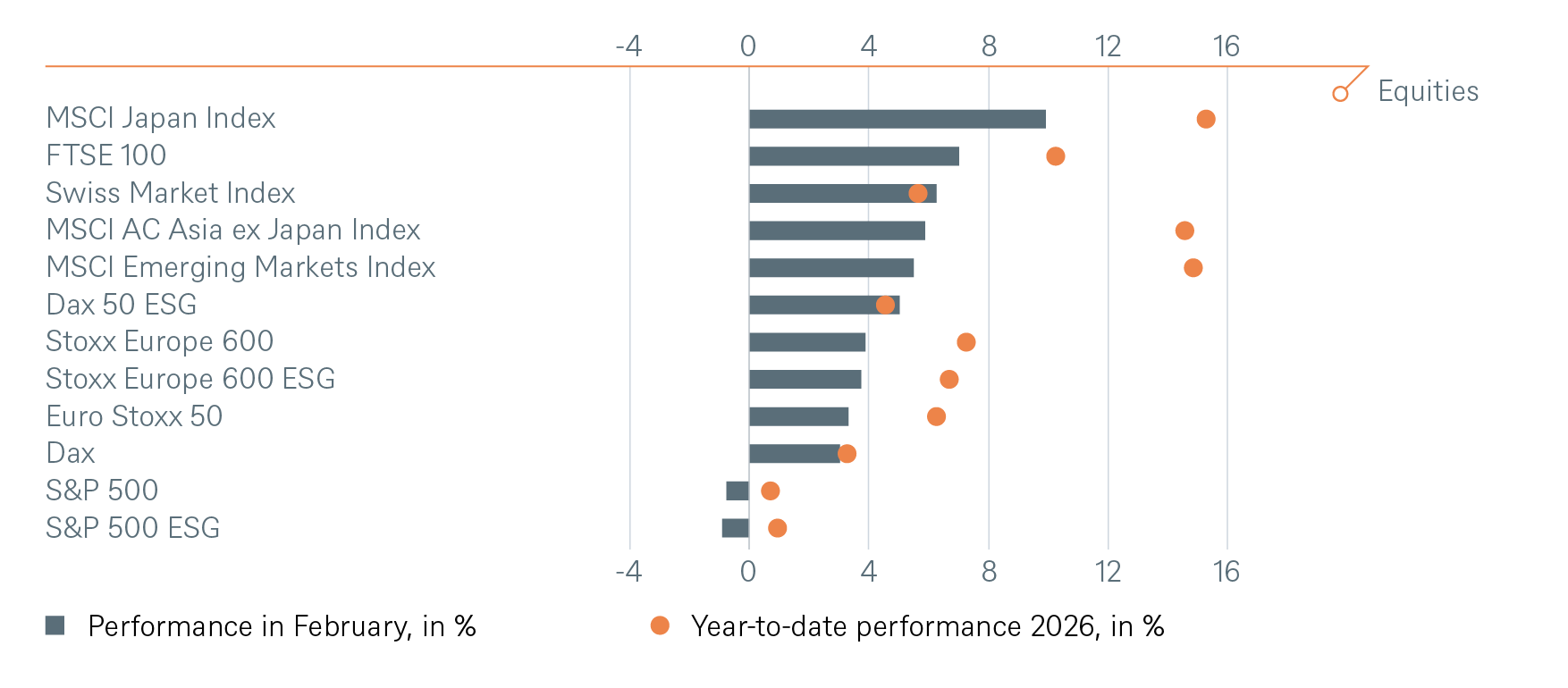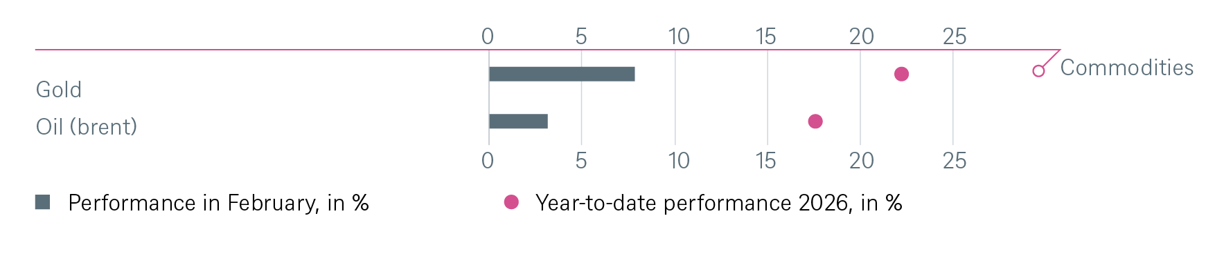 Finally, disruption from AI has become a dominant theme on global equity markets. Newly announced innovations such as ever better AI models, vibe coding, or the potential for agentic orchestration have called into question the viability of whole business models and raised uncertainty about potential winners. Indeed, the list of perceived AI losers is growing by the day. In particular, the shares of the enterprise software sector have been hit severely. We have downgraded the software sector in late January to neutral. Our thinking was that the arrival of new AI-native competitors and the transition from recurring Software-as-a-Service revenues towards more cyclical sales streams will require a reassessment of the sector. Nevertheless, we are still actively screening the sector for ideas that we think have been oversold. Disruption can also bring opportunity in our view.