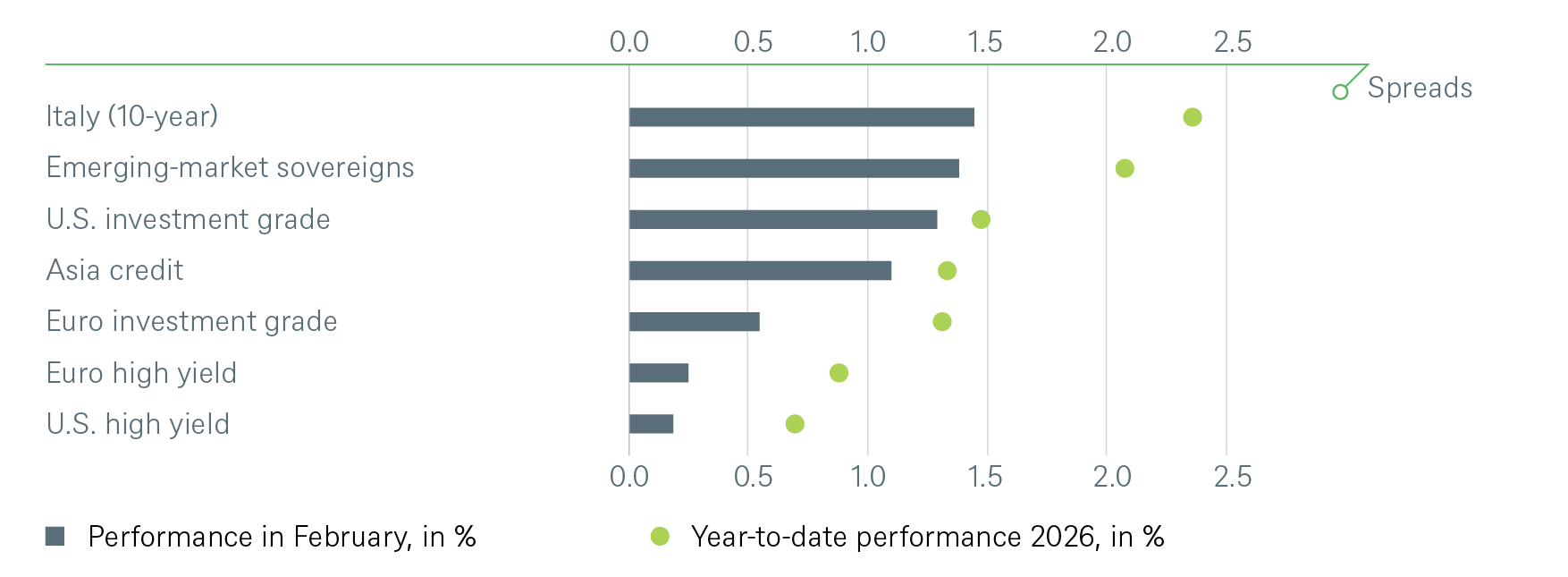 For corporates, securitized/specialties and emerging-market bonds in U.S. dollars, the signals depict the option-adjusted spread over U.S. Treasuries. For bonds denominated in euros, the illustration depicts the spread in comparison with German Bunds. Both spread and sovereign-bond-yield trends influence the bond value. For investors seeking to profit only from spread trends, a hedge against changing interest rates may be a consideration.