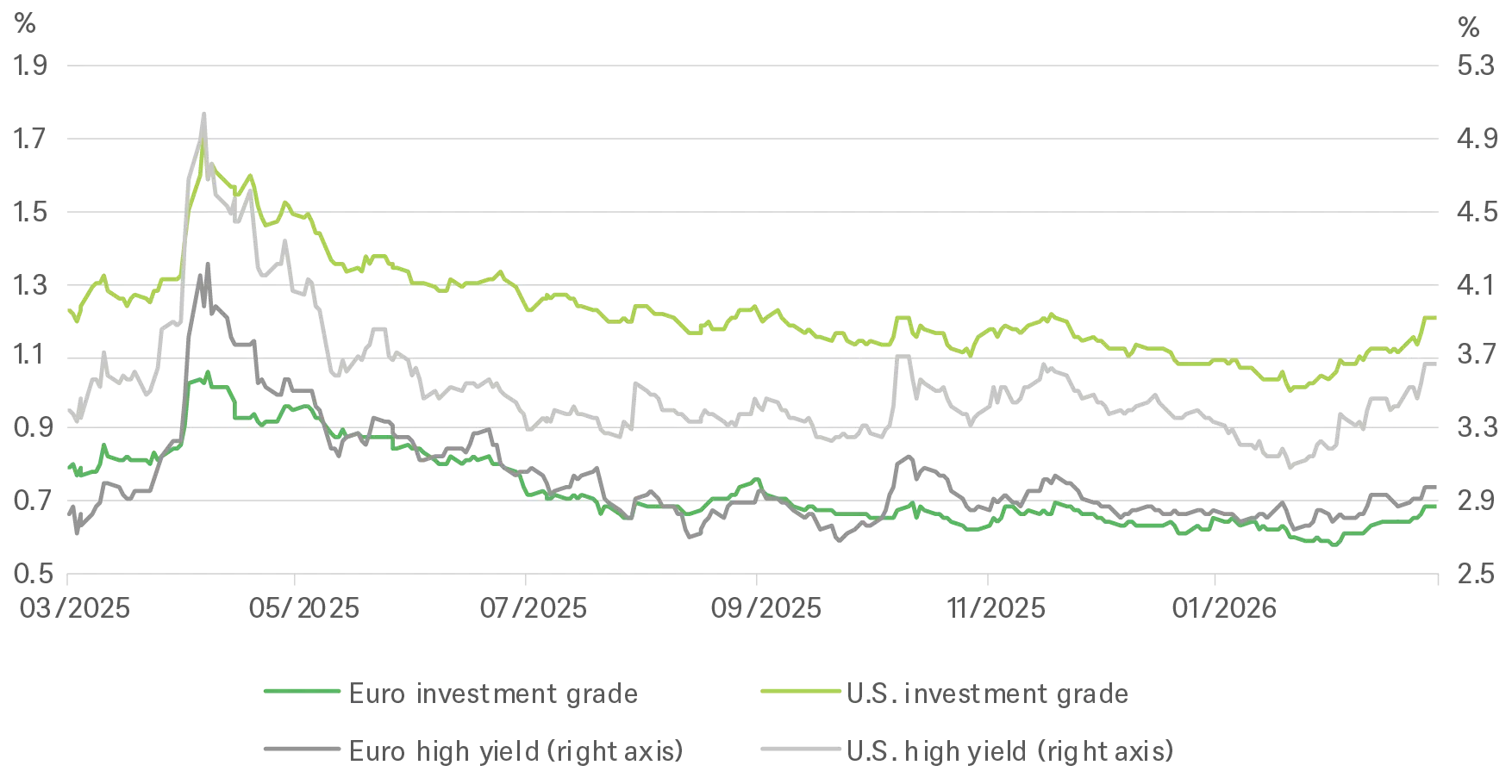 In the high-yield space, we forecast some widening of spreads in the U.S. to 325bps, and to 280bps in Europe. In the U.S., our call is based on slightly fragile valuations, low risk premia and potential AI disruption as a headwind for smaller, less flexible credits. Outflows and refinancing risks are noted, but we don’t expect to see a marked spike in defaults. In Europe, we expect some spread widening due to bifurcation – higher quality names should remain tight, but lower-rated sectors (chemicals, software and private-equity deals) are vulnerable. We expect default rates to fall to 2.5-3%, but recoveries may worsen. Our concerns include covenant quality, and private credit standards.
