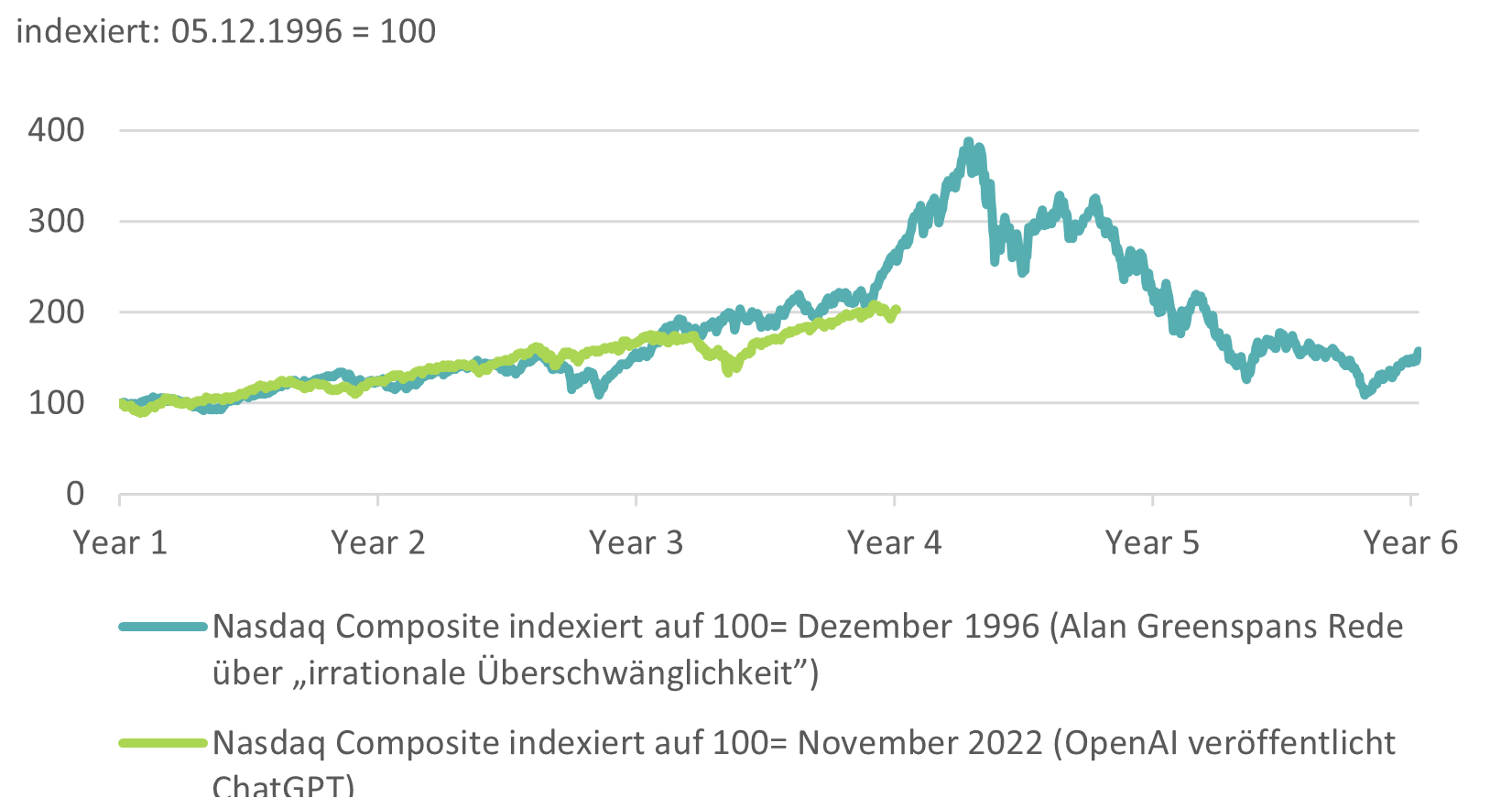It’s hardly surprising that many parallels are currently being drawn to the last major tech boom. We don’t particularly like these comparisons – you quickly find as many differences as similarities. When does a price trend become a bubble, and when is it simply an overvaluation? At what point have the three bubble criteria (disruption through innovation, far above-average valuation, financial leverage) reached critical thresholds? Do we first need to see the absurdities of the turn of the millennium to call it a bubble? Back then, the Nasdaq 100 doubled within six months before reaching its peak.