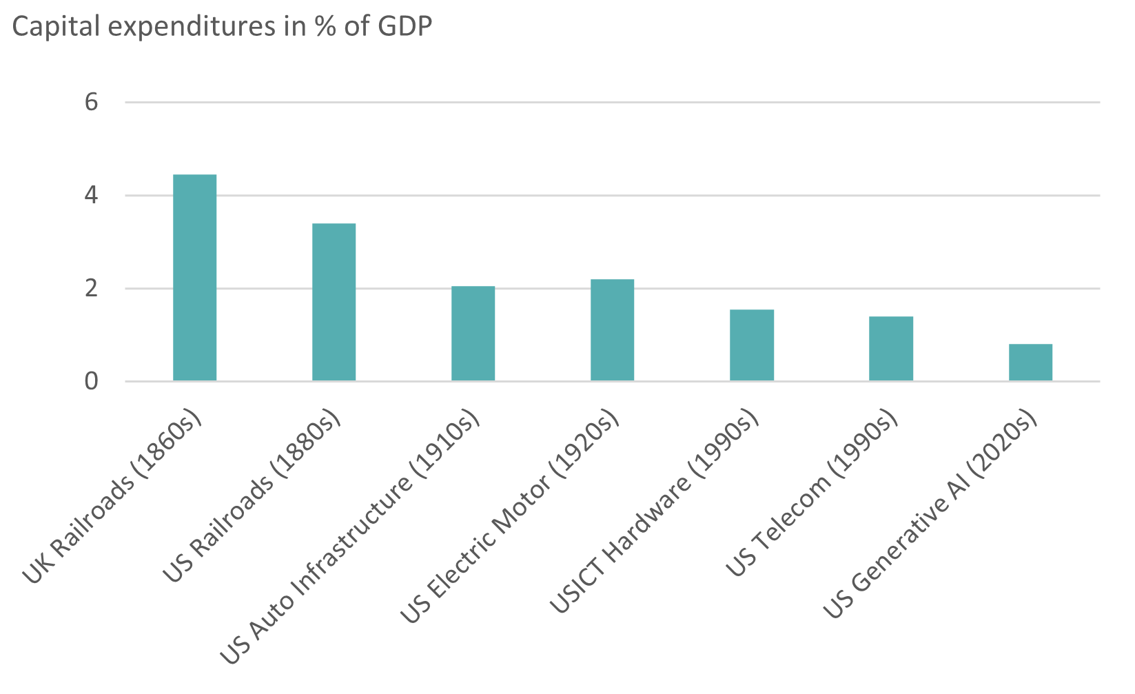 Comparisons with major investment periods of the past are also popular for assessing systemic risk. The expansion of the railway network and the fiber-optic network are particularly relevant examples. Figure 3.2a shows the unadjusted investment amounts as a percentage of gross domestic product (GDP). Based on this, the current AI build-out still appears modest compared to previous technology surges. However, some argue that, given the significantly shorter lifespan of AI infrastructure – especially compared to the rail network – these ratios could eventually converge.