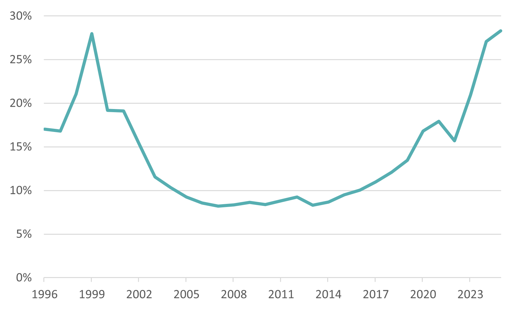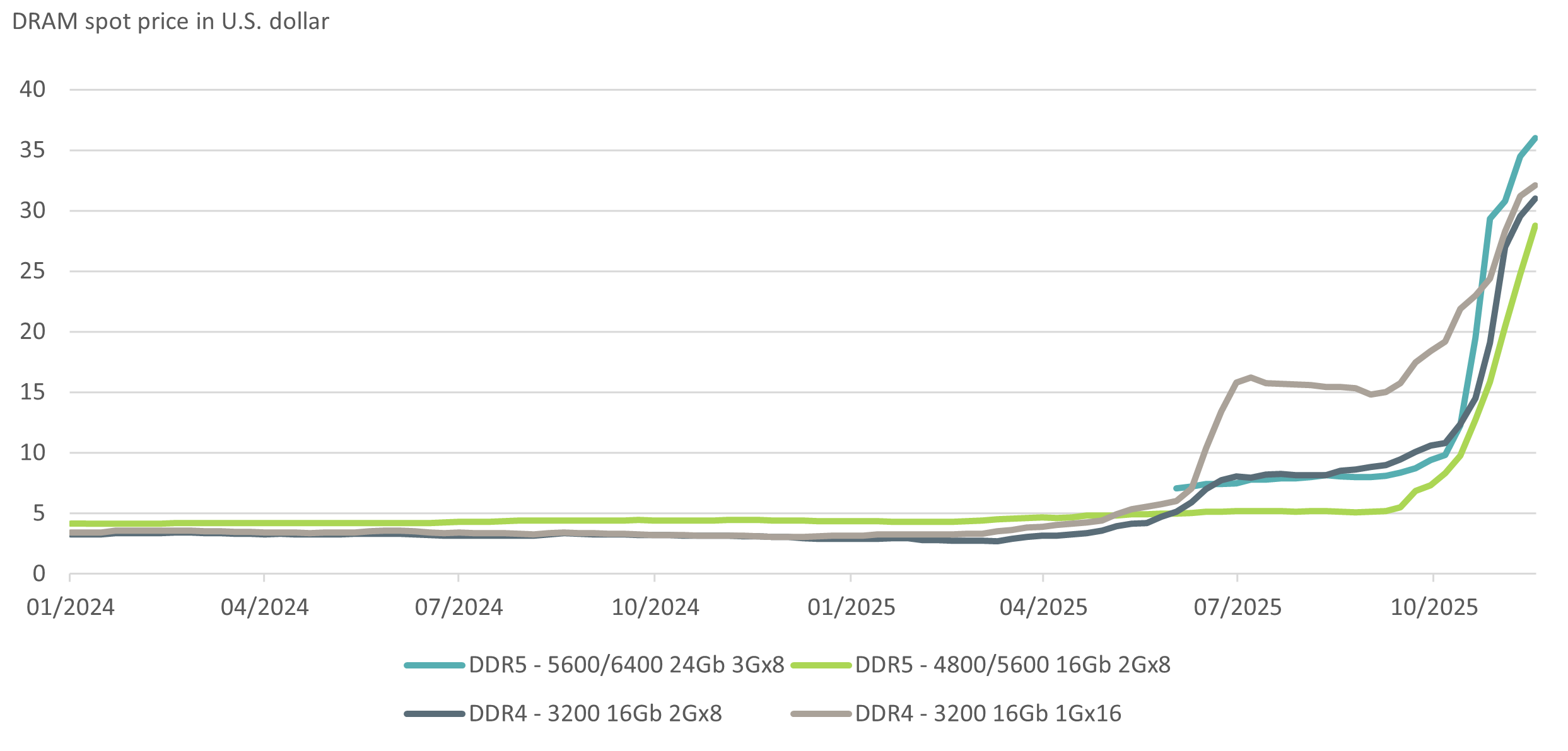 Throughout the past year, bottlenecks have increasingly been mentioned in connection with AI. Where triple-digit growth rates are being pushed, there is always a choke point somewhere in the value chain. The most frequently cited are electricity and chips (whether GPUs or memory chips). Equity and debt financing for growth could also be added to the list, given the increasingly complex funding models. These are necessary in part because analysts at Morgan Stanley16believe that only about half of the USD 3 trillion in data center investments projected by 2028 can be covered through internal financing. The extremes of this supply-demand imbalance are illustrated by Nvidia‘s gross margin of around 75 percent (and its sold-out products), as well as the price trends for memory chips – see Fig. 6.1. Contract manufacturer TSMC is also currently unable to keep up with production and says that it does not intends to raise capacity to match demand.