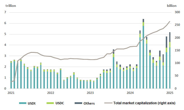 In recent years, stablecoins have evolved from a niche product into a vital component of the digital financial landscape. With a market capitalization exceeding USD 250bn and transaction volumes surpassing those of Visa and Mastercard combined, stablecoins have long transcended their role as a tool for crypto traders. Notably, stablecoins such as USDT (Tether) and USDC (USD Coin) have become liquid, globally tradable and price-stable instruments. These characteristics make them increasingly attractive to private and institutional investors.